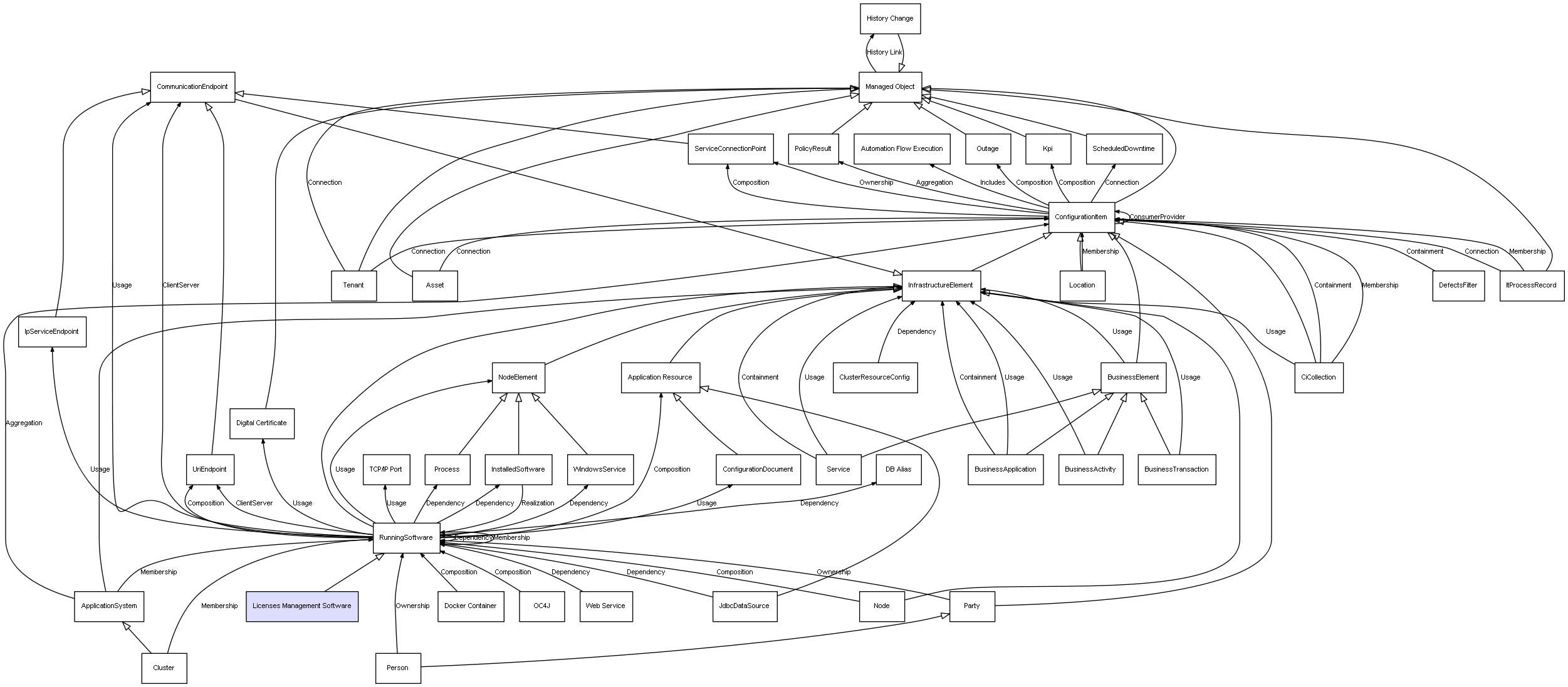 | ConfigurationItem | ServiceConnectionPoint | Composition | Represents a relation between 2 objects where one is contained within the other, and the included object can not exist without its container. Therefore, when the container is deleted, all its contained object will be automatically removed |
