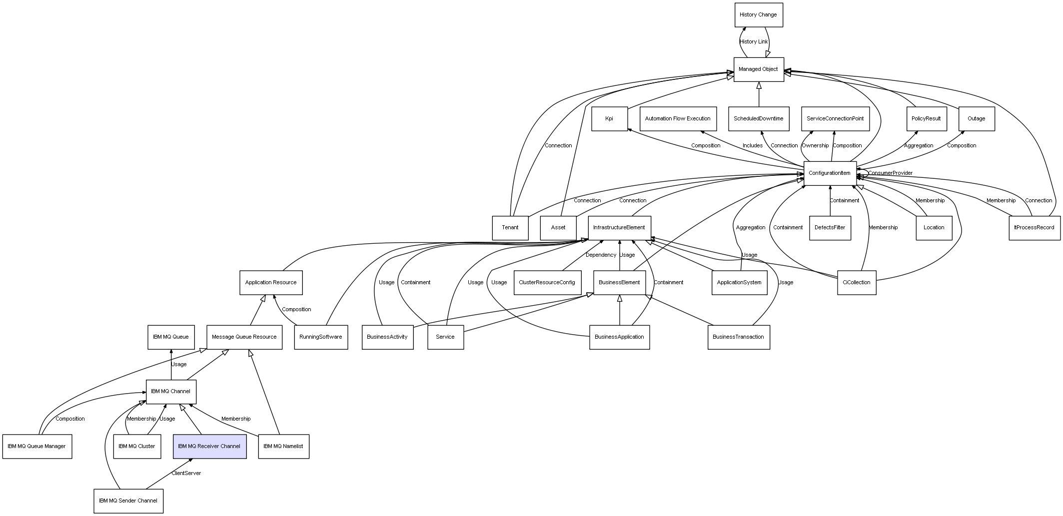 | IBM MQ Queue Manager | IBM MQ Channel | Composition | Represents a relation between 2 objects where one is contained within the other, and the included object can not exist without its container. Therefore, when the container is deleted, all its contained object will be automatically removed |