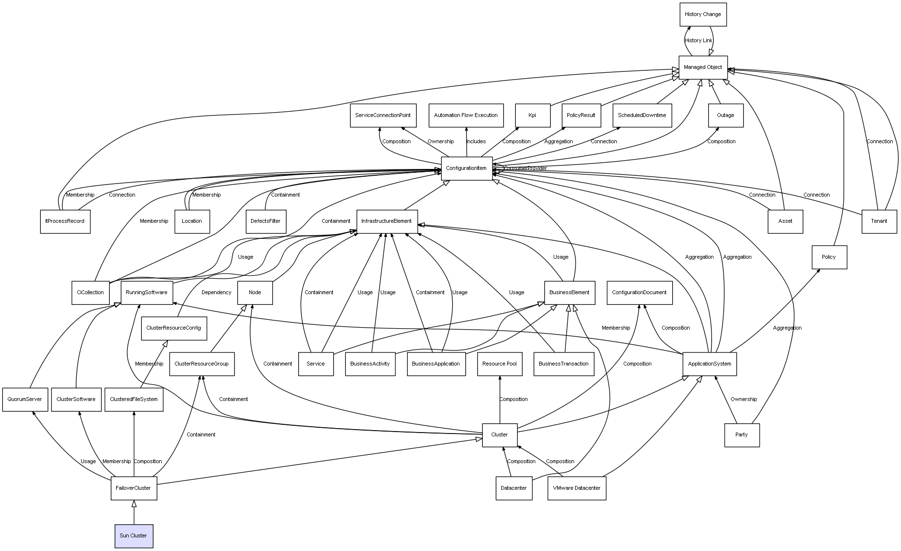 | Cluster | ConfigurationDocument | Composition | Represents a relation between 2 objects where one is contained within the other, and the included object can not exist without its container. Therefore, when the container is deleted, all its contained object will be automatically removed |