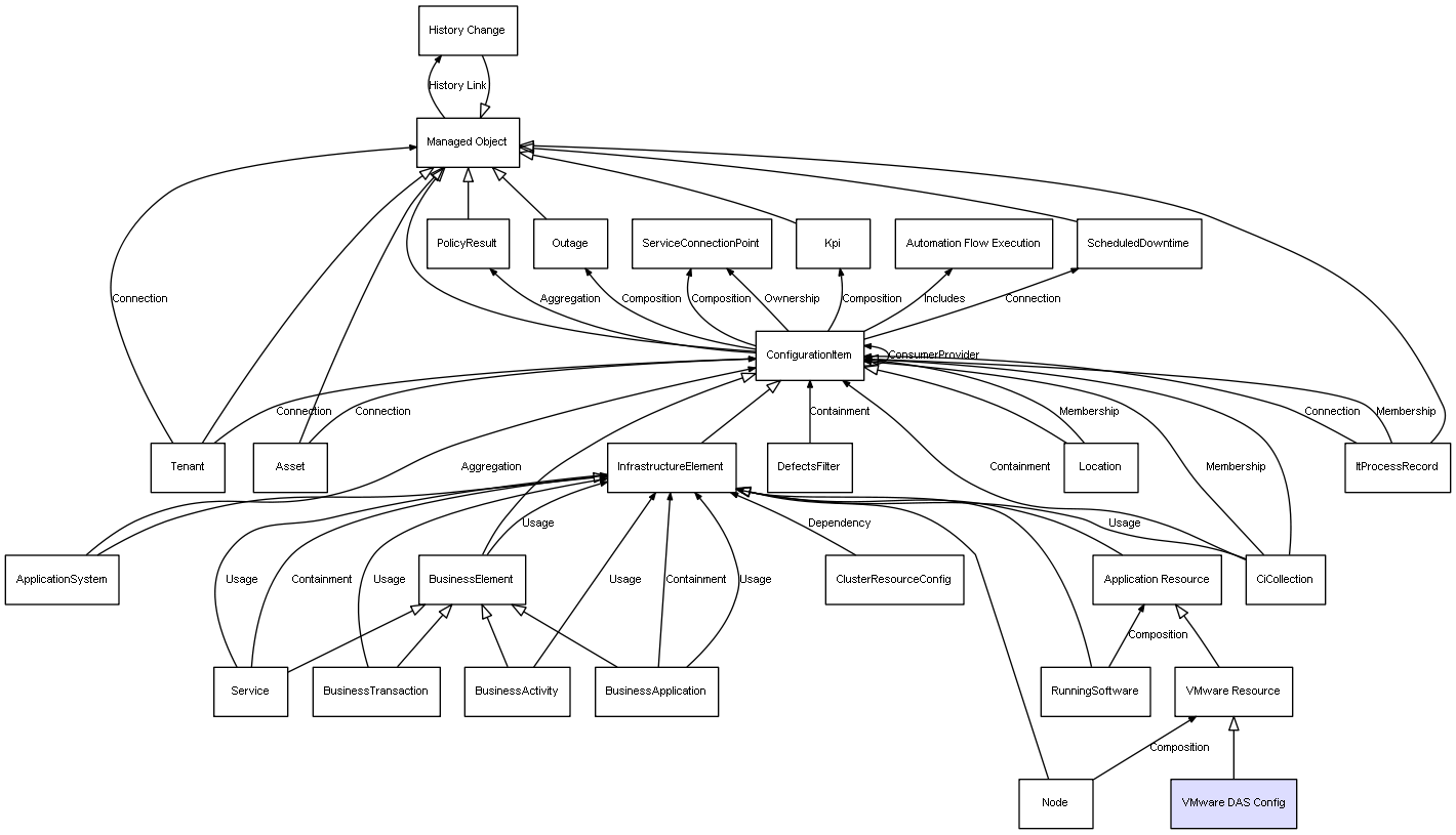 | Node | VMware Resource | Composition | Represents a relation between 2 objects where one is contained within the other, and the included object can not exist without its container. Therefore, when the container is deleted, all its contained object will be automatically removed |