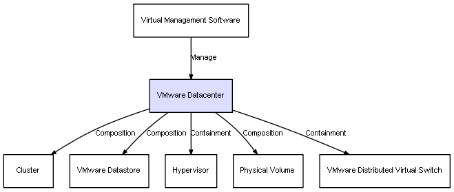 | VMware Datacenter | VMware Datastore | Composition | Represents a relation between 2 objects where one is contained within the other, and the included object can not exist without its container. Therefore, when the container is deleted, all its contained object will be automatically removed |