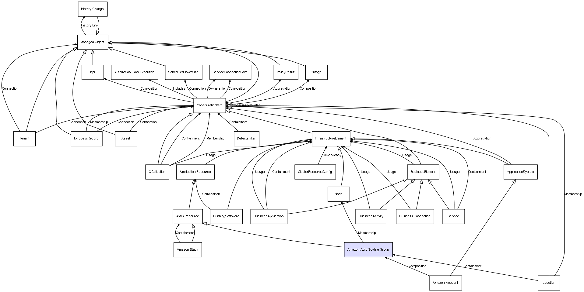 | ConfigurationItem | ServiceConnectionPoint | Composition | Represents a relation between 2 objects where one is contained within the other, and the included object can not exist without its container. Therefore, when the container is deleted, all its contained object will be automatically removed |