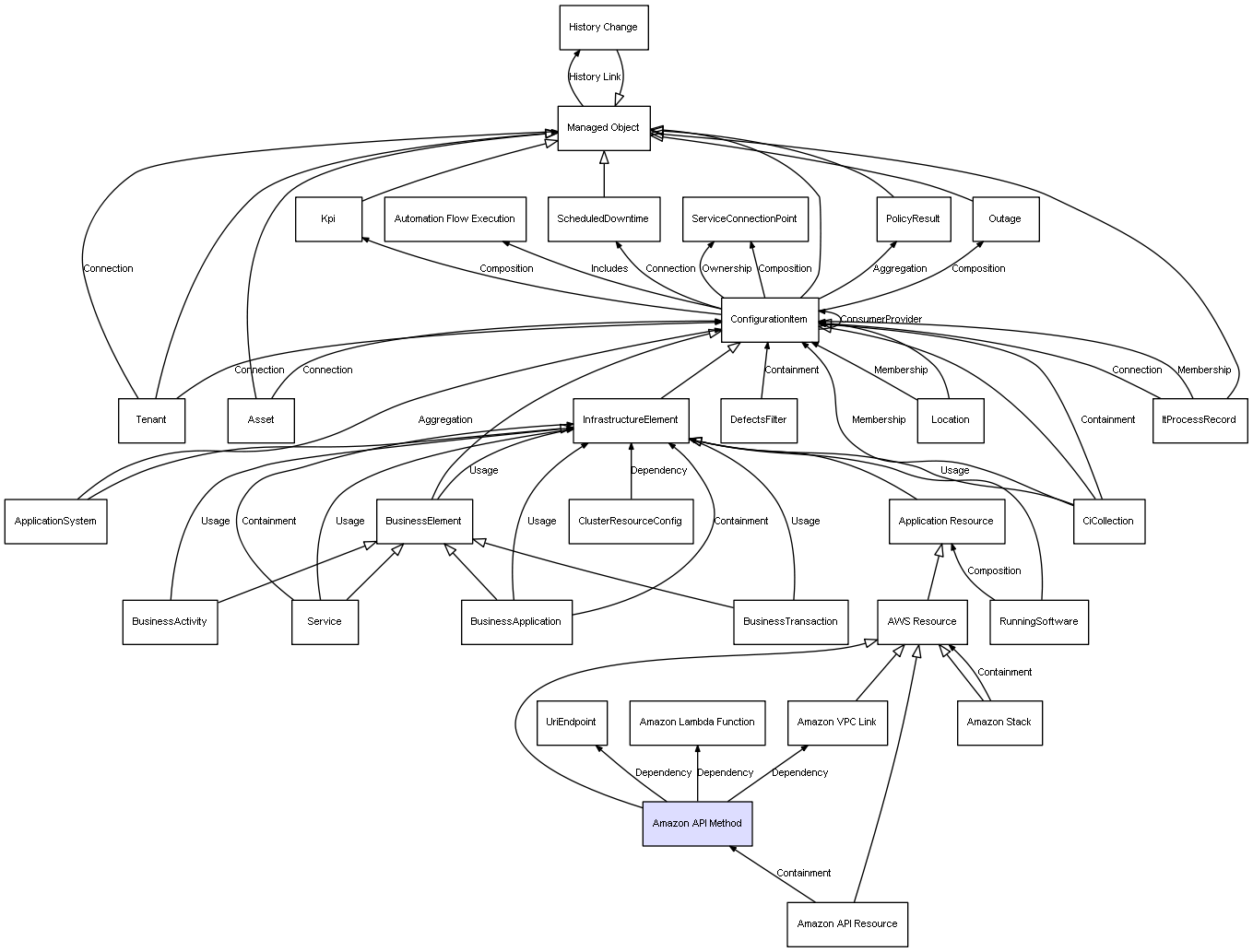 | ConfigurationItem | ServiceConnectionPoint | Composition | Represents a relation between 2 objects where one is contained within the other, and the included object can not exist without its container. Therefore, when the container is deleted, all its contained object will be automatically removed |