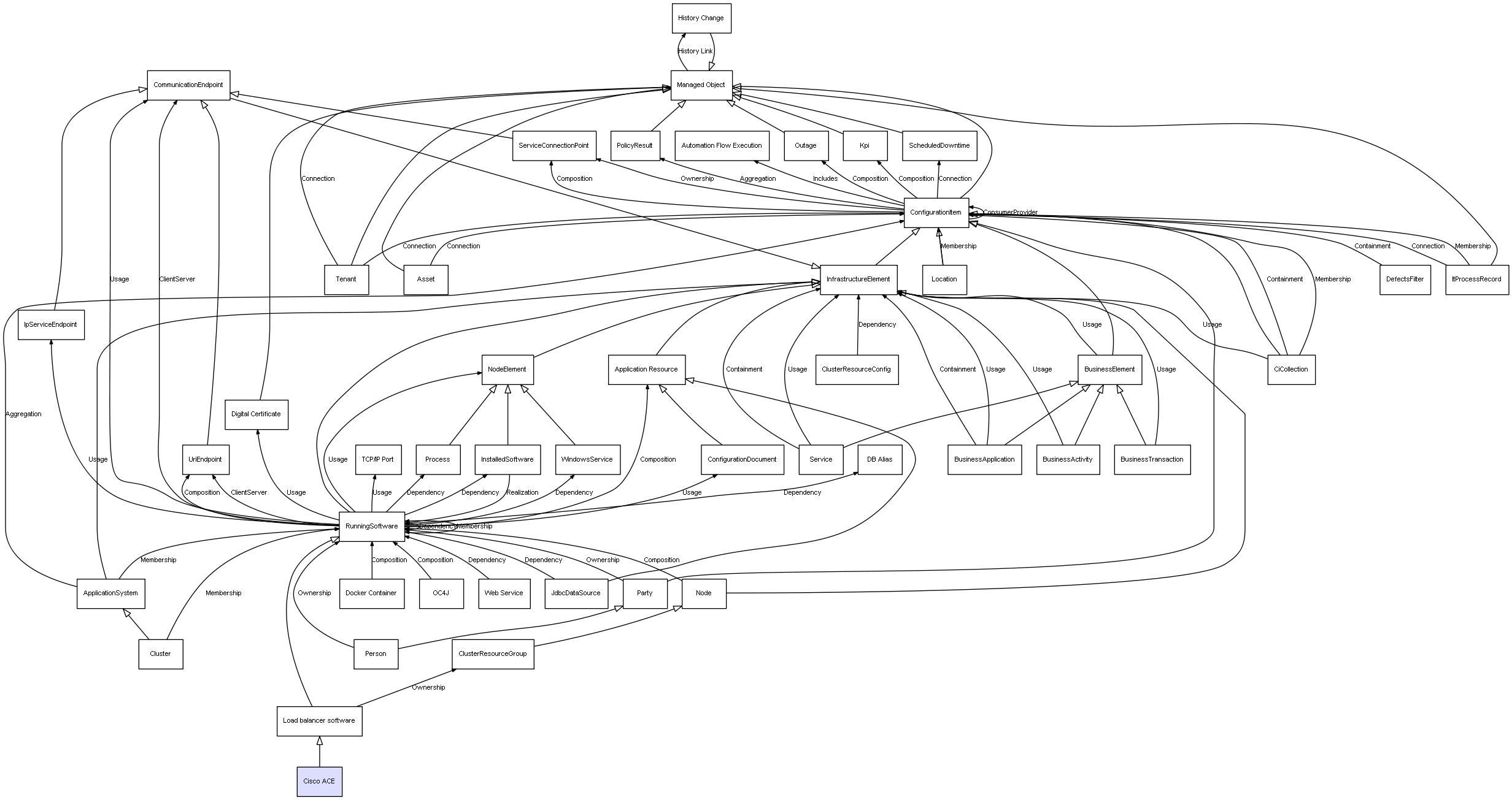 | ConfigurationItem | ServiceConnectionPoint | Composition | Represents a relation between 2 objects where one is contained within the other, and the included object can not exist without its container. Therefore, when the container is deleted, all its contained object will be automatically removed |