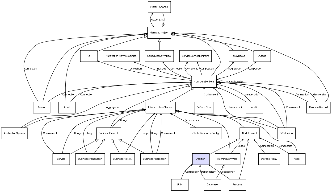 | ConfigurationItem | Outage | Composition | Represents a relation between 2 objects where one is contained within the other, and the included object can not exist without its container. Therefore, when the container is deleted, all its contained object will be automatically removed |