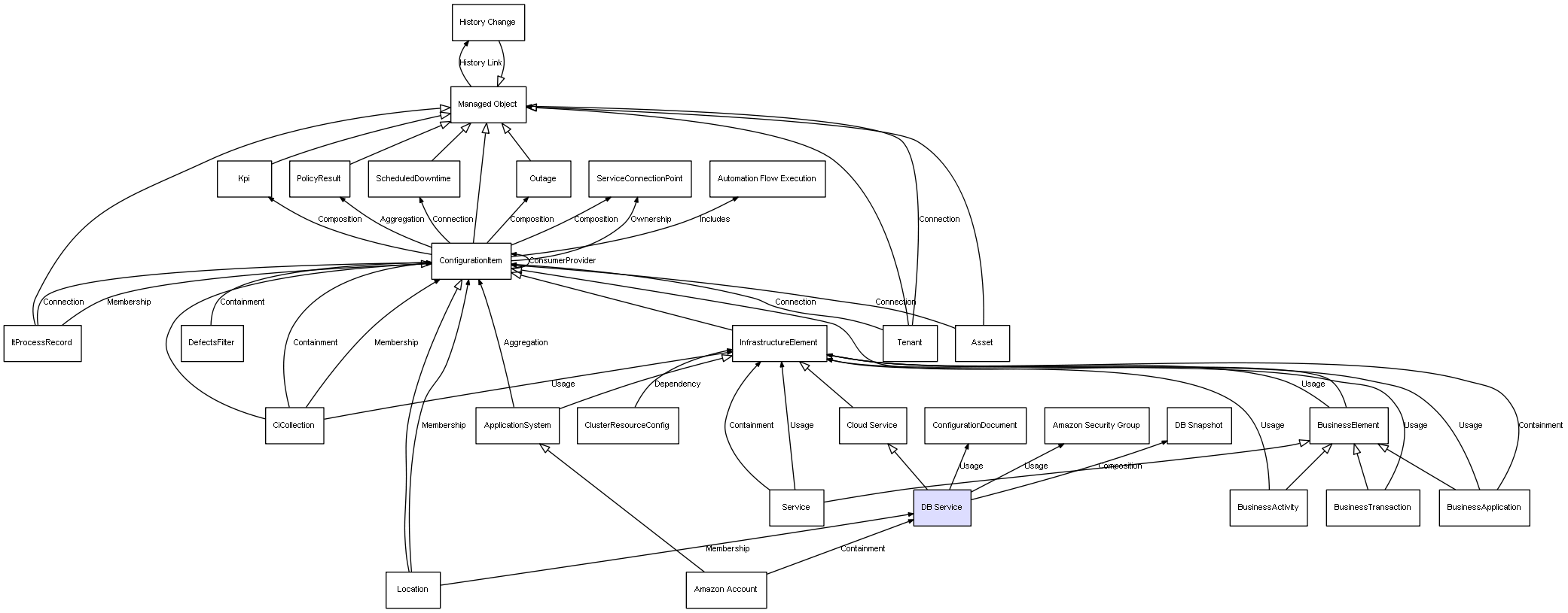 | ConfigurationItem | ServiceConnectionPoint | Composition | Represents a relation between 2 objects where one is contained within the other, and the included object can not exist without its container. Therefore, when the container is deleted, all its contained object will be automatically removed |
