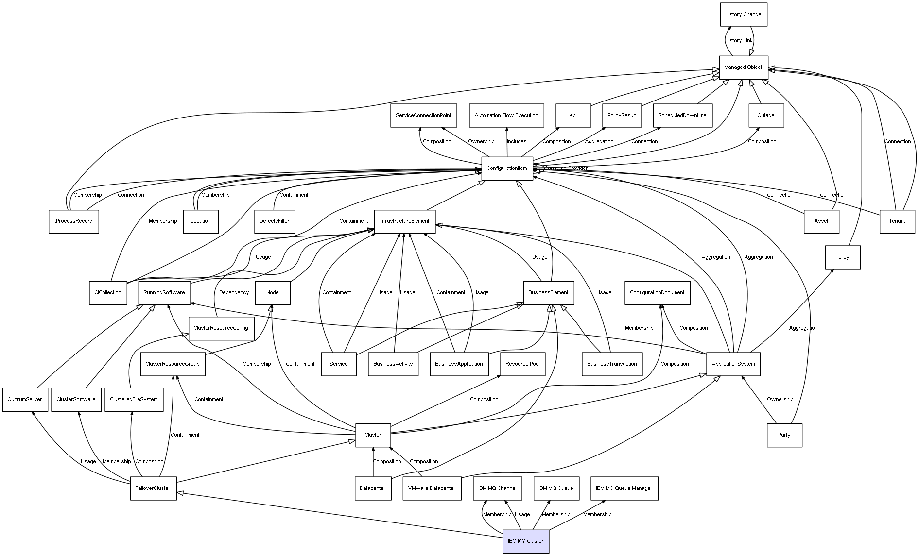| Cluster | ConfigurationDocument | Composition | Represents a relation between 2 objects where one is contained within the other, and the included object can not exist without its container. Therefore, when the container is deleted, all its contained object will be automatically removed |