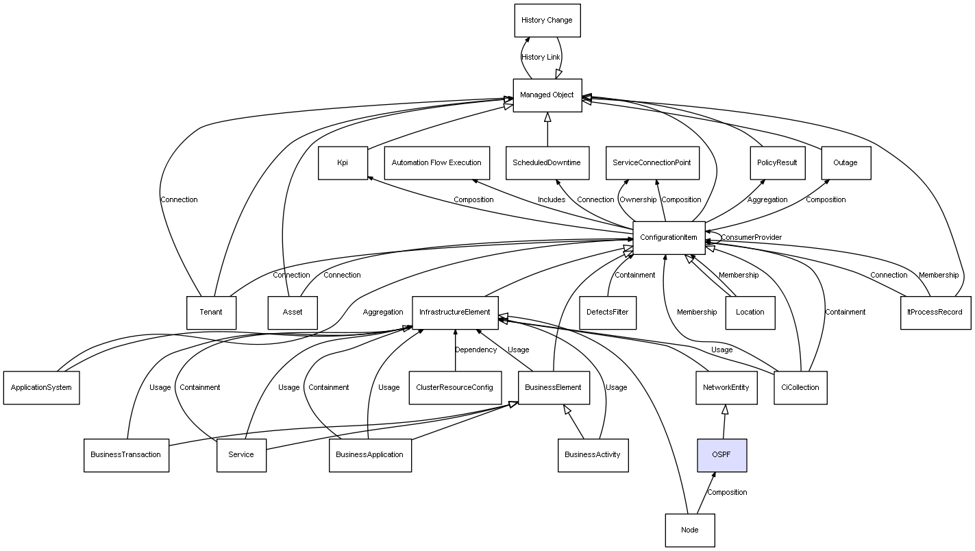 | Node | OSPF | Composition | Represents a relation between 2 objects where one is contained within the other, and the included object can not exist without its container. Therefore, when the container is deleted, all its contained object will be automatically removed |