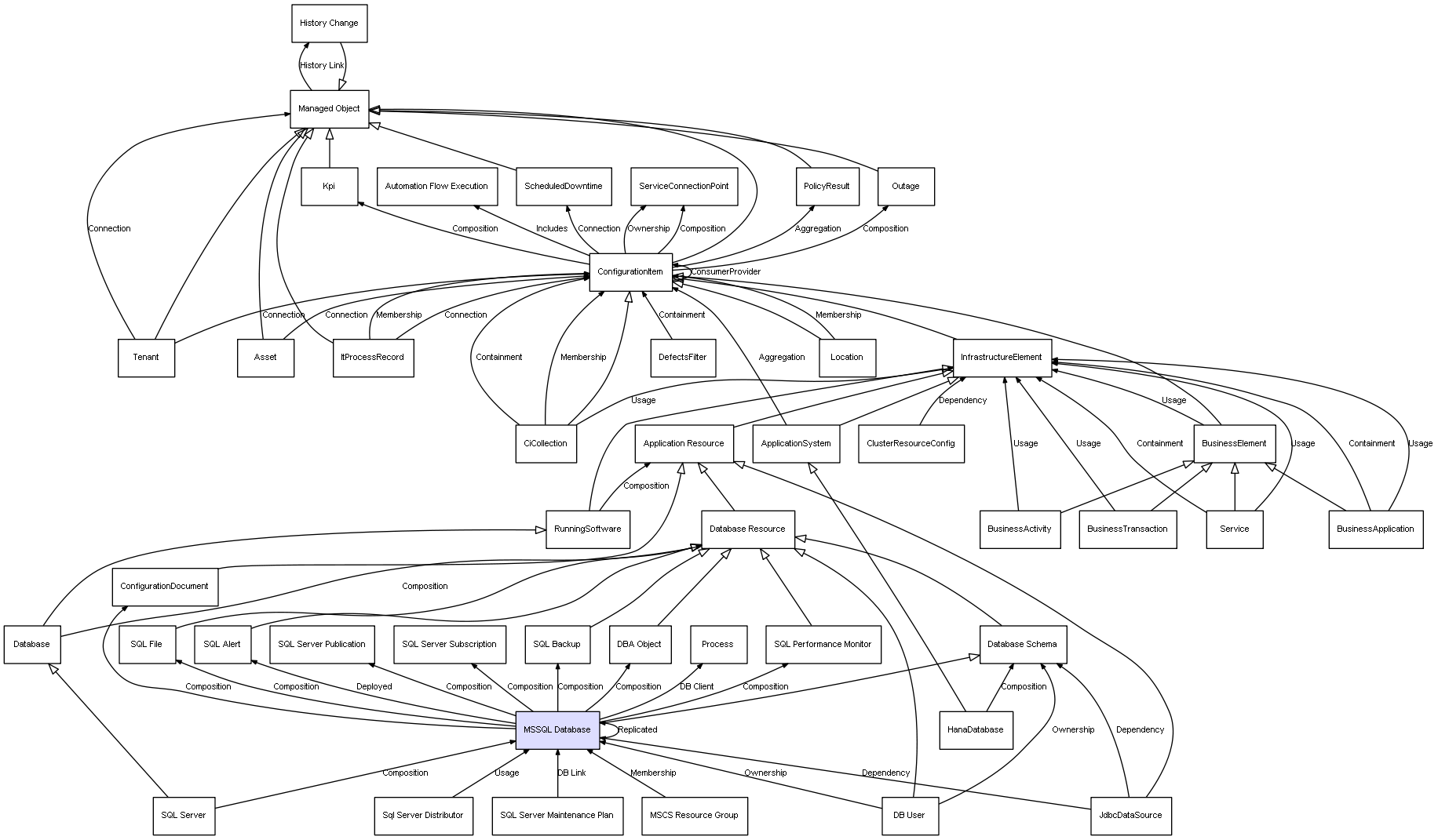 | MSSQL Database | ConfigurationDocument | Composition | Represents a relation between 2 objects where one is contained within the other, and the included object can not exist without its container. Therefore, when the container is deleted, all its contained object will be automatically removed |