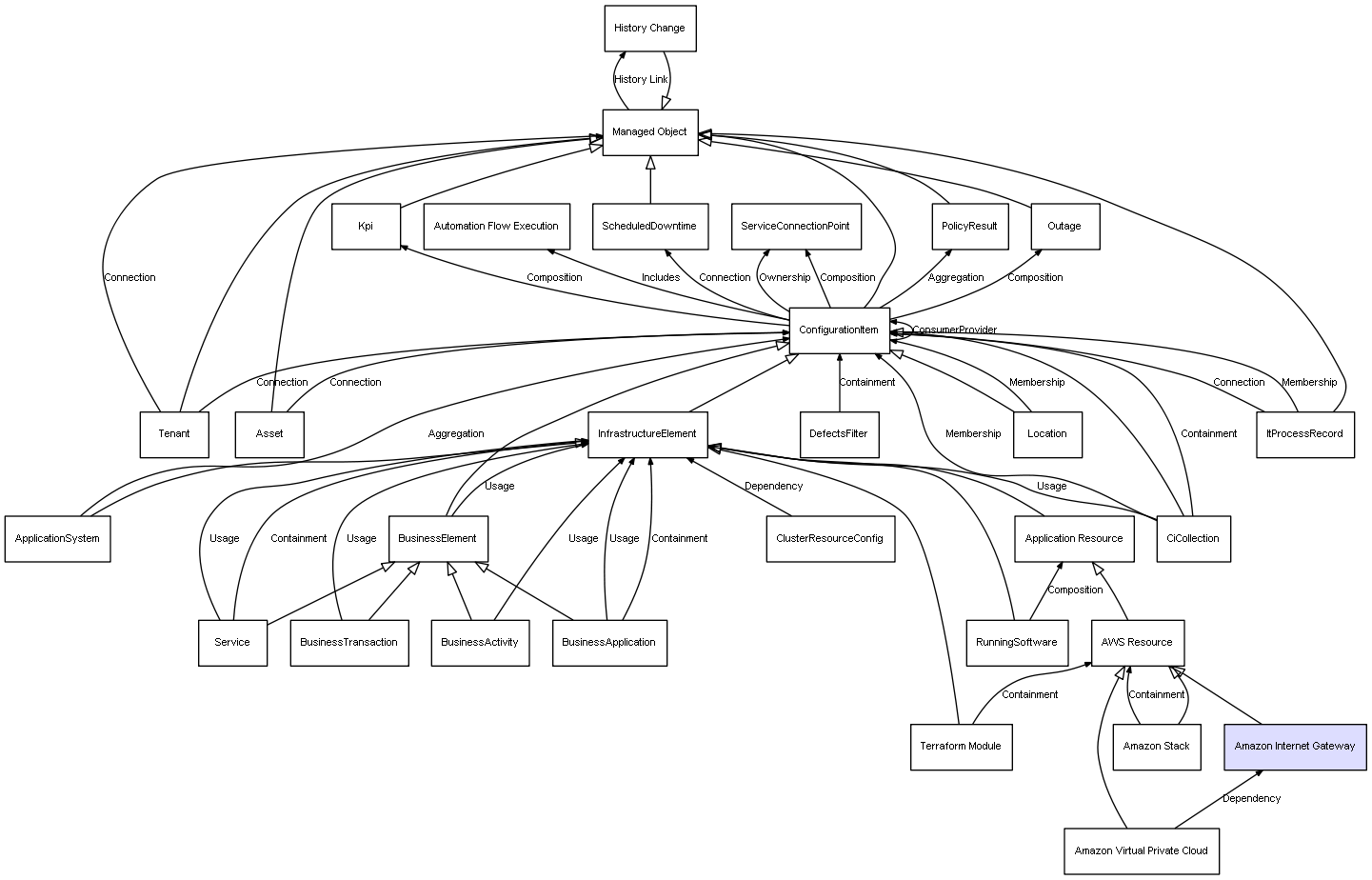 | ConfigurationItem | ServiceConnectionPoint | Composition | Represents a relation between 2 objects where one is contained within the other, and the included object can not exist without its container. Therefore, when the container is deleted, all its contained object will be automatically removed |