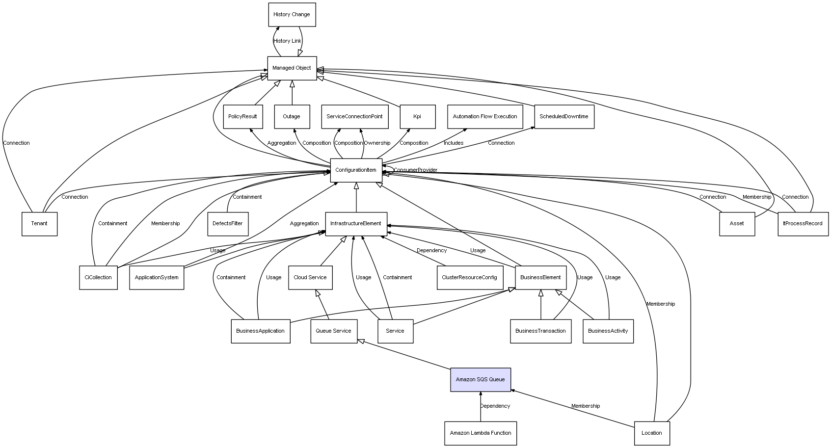 | ConfigurationItem | ServiceConnectionPoint | Composition | Represents a relation between 2 objects where one is contained within the other, and the included object can not exist without its container. Therefore, when the container is deleted, all its contained object will be automatically removed |