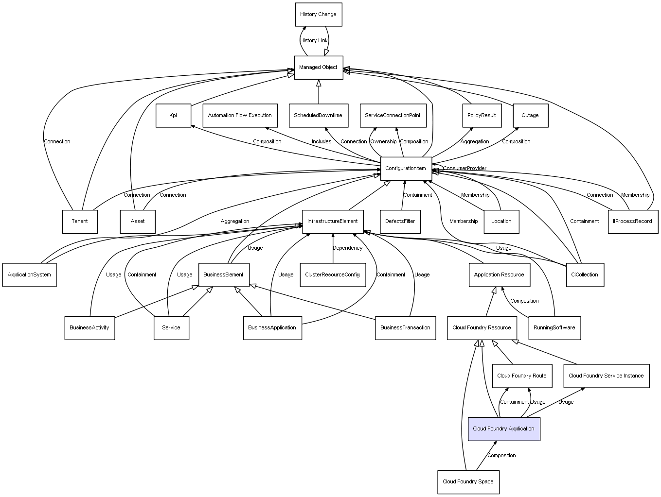 | Cloud Foundry Space | Cloud Foundry Application | Composition | Represents a relation between 2 objects where one is contained within the other, and the included object can not exist without its container. Therefore, when the container is deleted, all its contained object will be automatically removed |