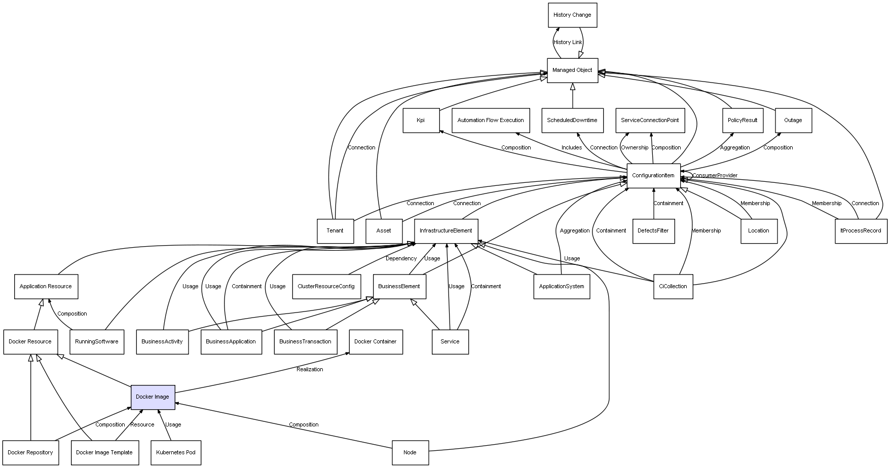 | Docker Repository | Docker Image | Composition | Represents a relation between 2 objects where one is contained within the other, and the included object can not exist without its container. Therefore, when the container is deleted, all its contained object will be automatically removed |