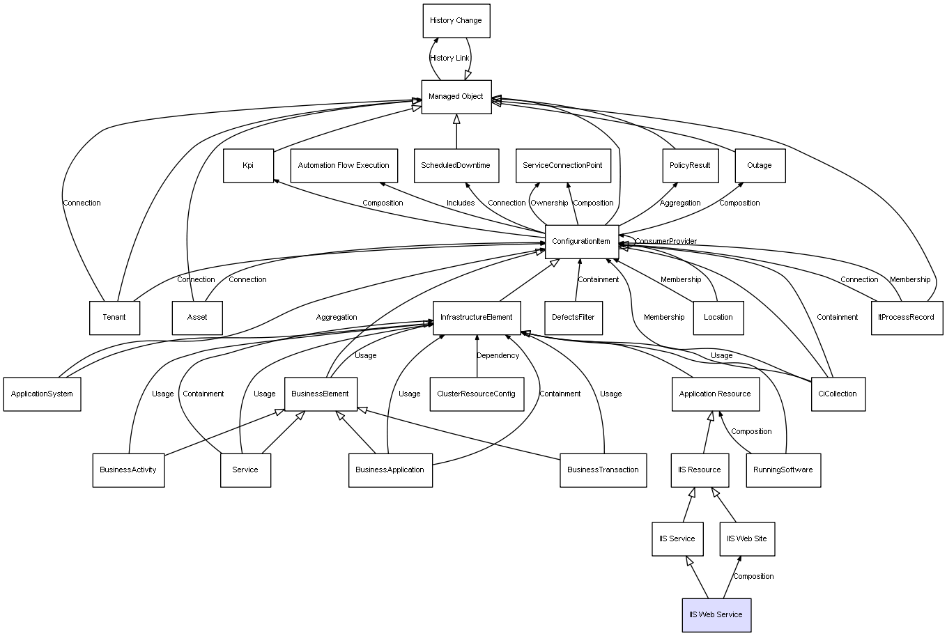 | ConfigurationItem | ServiceConnectionPoint | Composition | Represents a relation between 2 objects where one is contained within the other, and the included object can not exist without its container. Therefore, when the container is deleted, all its contained object will be automatically removed |