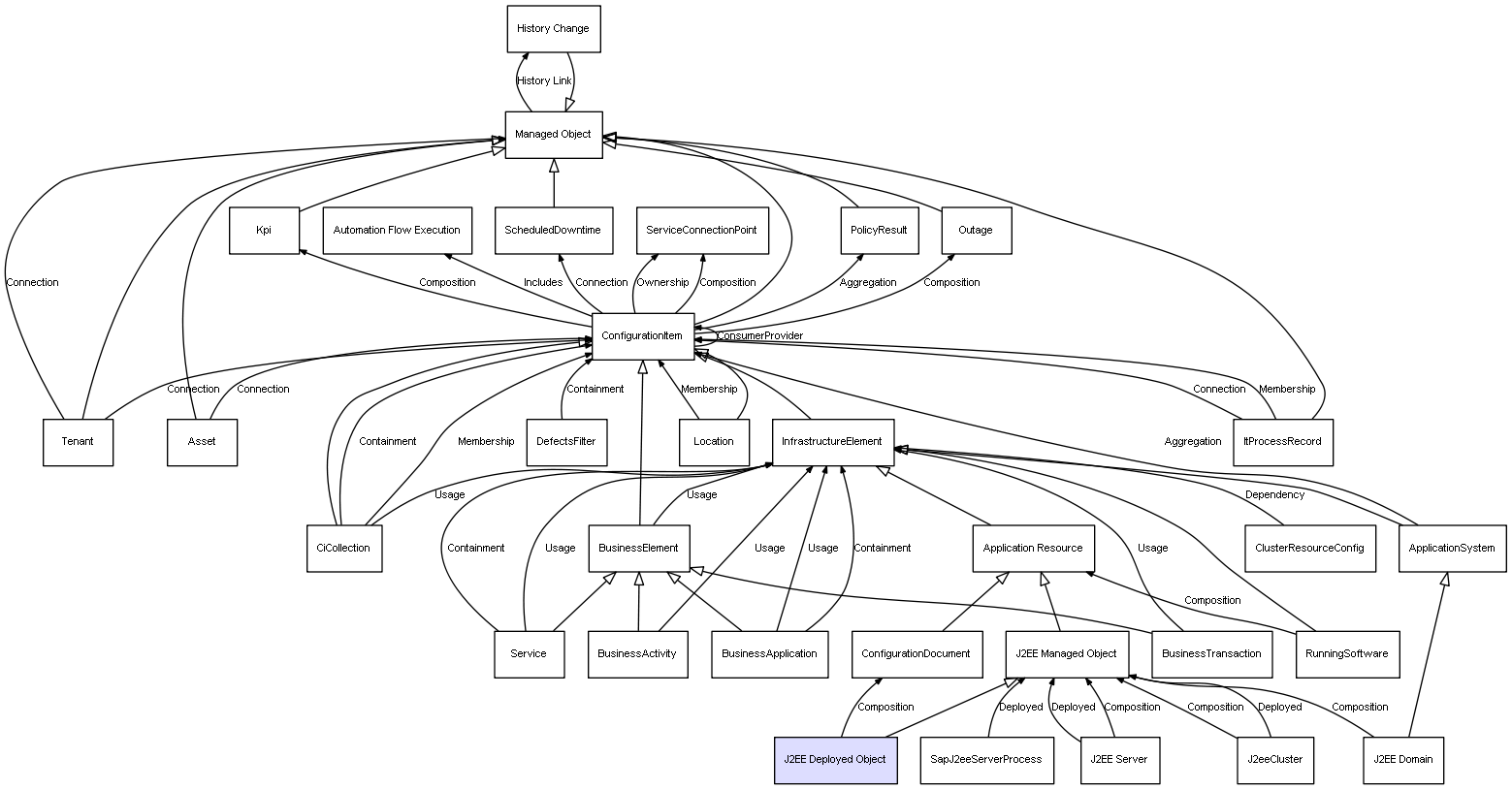 | J2EE Server | J2EE Managed Object | Composition | Represents a relation between 2 objects where one is contained within the other, and the included object can not exist without its container. Therefore, when the container is deleted, all its contained object will be automatically removed |