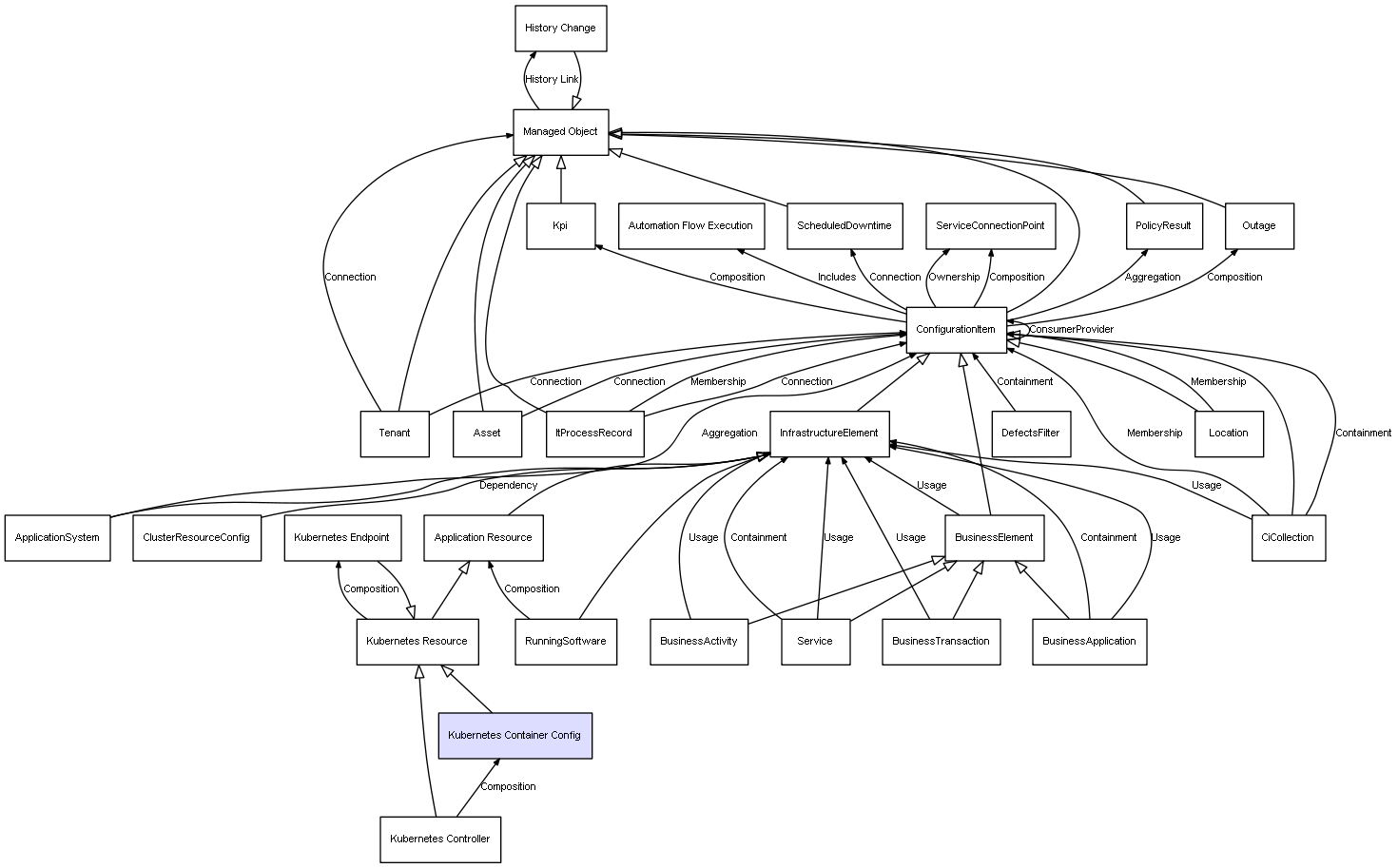 | Kubernetes Controller | Kubernetes Container Config | Composition | Represents a relation between 2 objects where one is contained within the other, and the included object can not exist without its container. Therefore, when the container is deleted, all its contained object will be automatically removed |