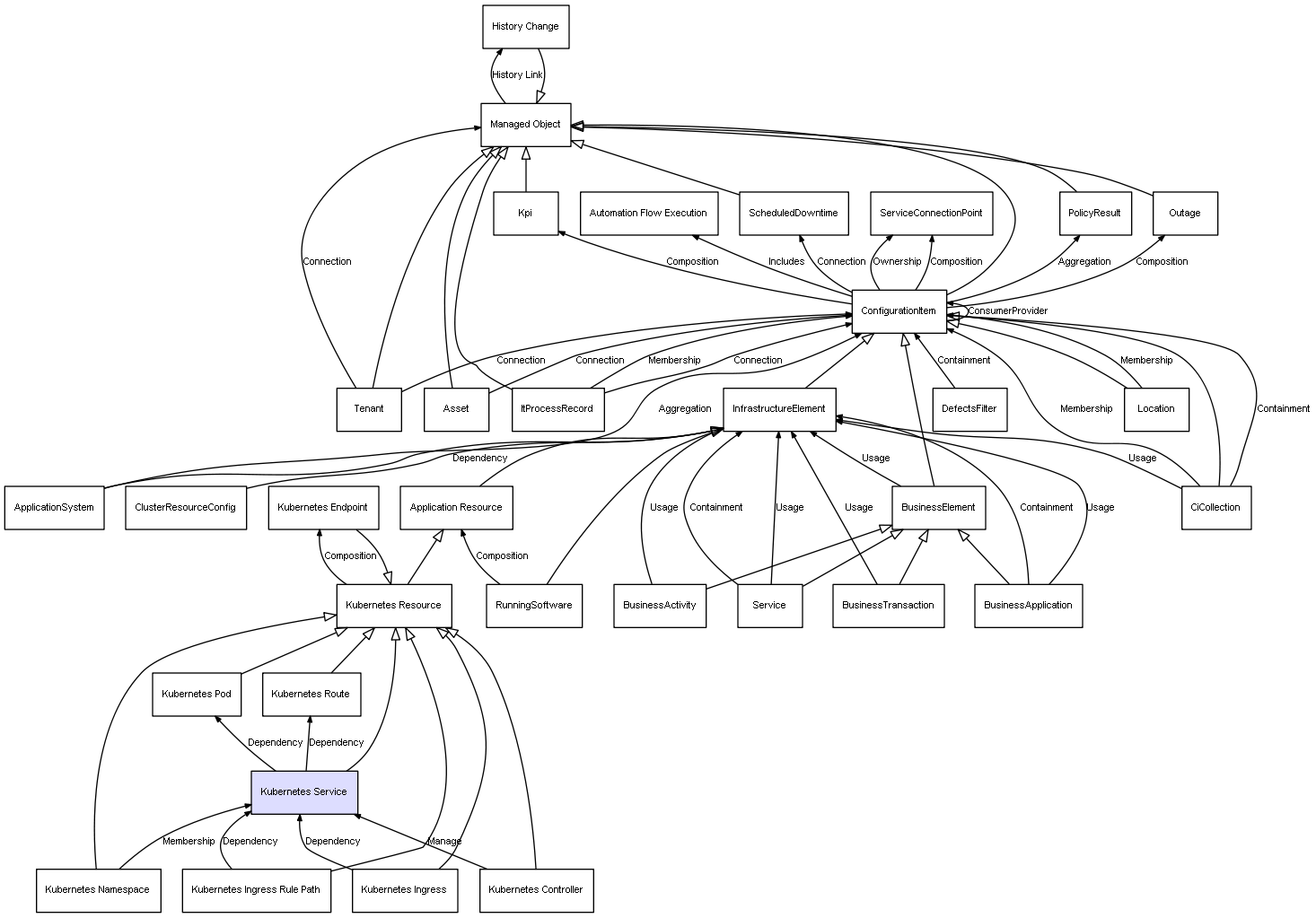 | ConfigurationItem | ServiceConnectionPoint | Composition | Represents a relation between 2 objects where one is contained within the other, and the included object can not exist without its container. Therefore, when the container is deleted, all its contained object will be automatically removed |