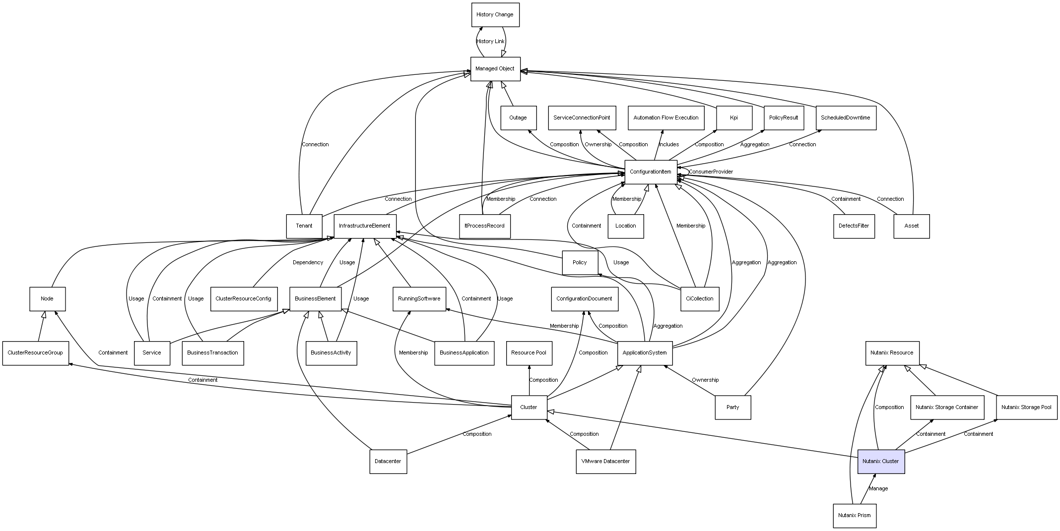 | Nutanix Cluster | Nutanix Resource | Composition | Represents a relation between 2 objects where one is contained within the other, and the included object can not exist without its container. Therefore, when the container is deleted, all its contained object will be automatically removed |
