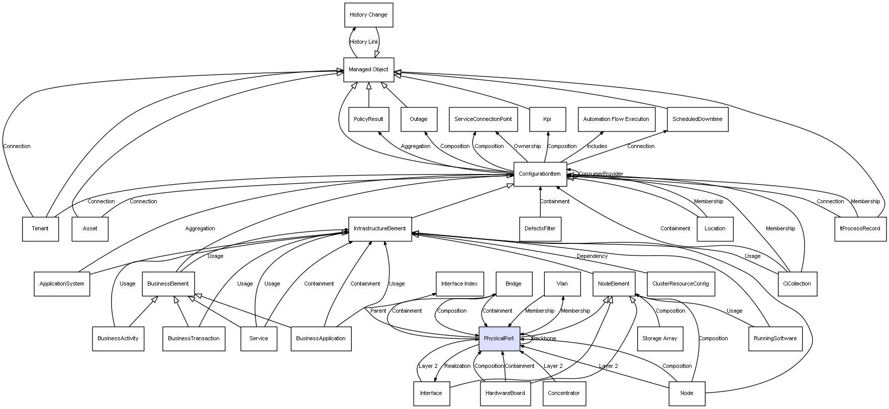 | Node | PhysicalPort | Composition | Represents a relation between 2 objects where one is contained within the other, and the included object can not exist without its container. Therefore, when the container is deleted, all its contained object will be automatically removed |