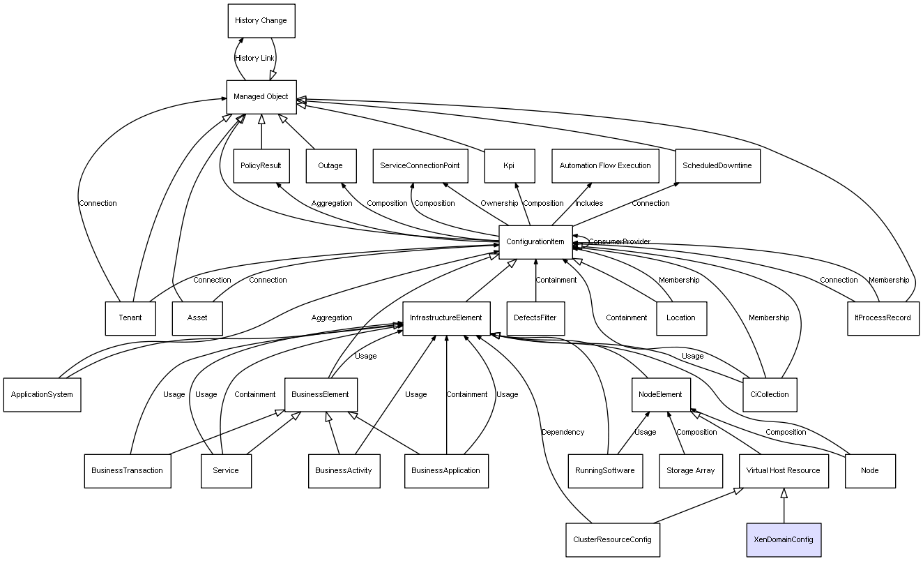| ConfigurationItem | Outage | Composition | Represents a relation between 2 objects where one is contained within the other, and the included object can not exist without its container. Therefore, when the container is deleted, all its contained object will be automatically removed |