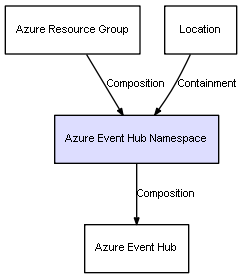 | Azure Resource Group | Azure Event Hub Namespace | Composition | Represents a relation between 2 objects where one is contained within the other, and the included object can not exist without its container. Therefore, when the container is deleted, all its contained object will be automatically removed |