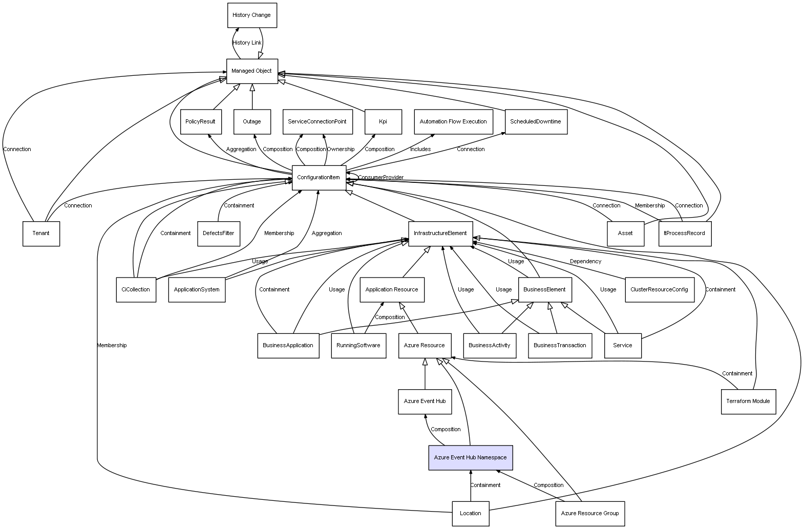 | Azure Event Hub Namespace | Azure Event Hub | Composition | Represents a relation between 2 objects where one is contained within the other, and the included object can not exist without its container. Therefore, when the container is deleted, all its contained object will be automatically removed |