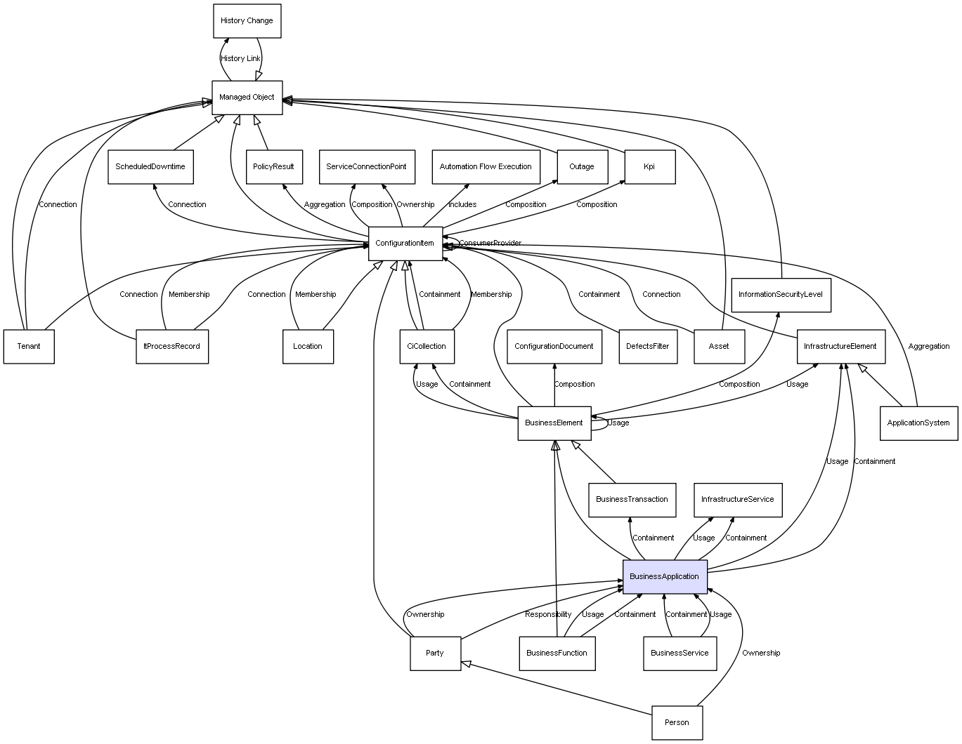 | ConfigurationItem | Outage | Composition | Represents a relation between 2 objects where one is contained within the other, and the included object can not exist without its container. Therefore, when the container is deleted, all its contained object will be automatically removed |