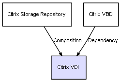 | Citrix Storage Repository | Citrix VDI | Composition | Represents a relation between 2 objects where one is contained within the other, and the included object can not exist without its container. Therefore, when the container is deleted, all its contained object will be automatically removed |