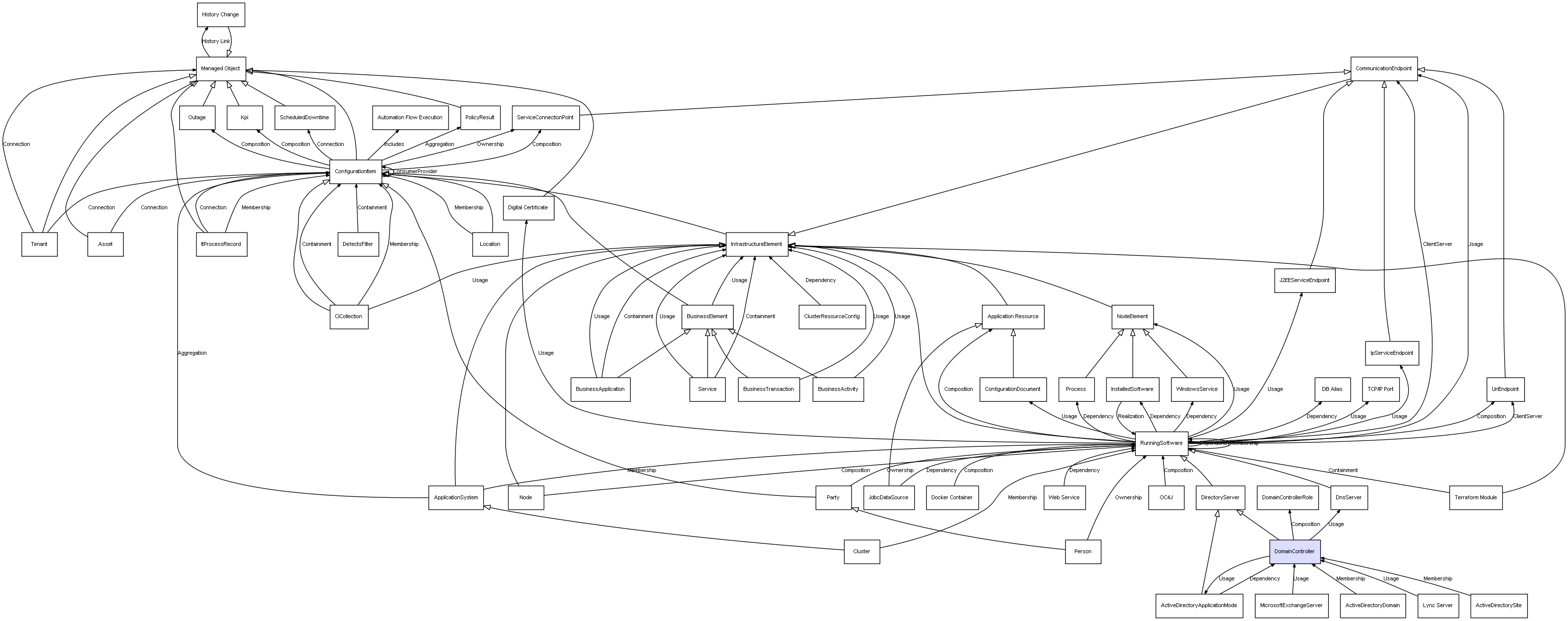 | ConfigurationItem | ServiceConnectionPoint | Composition | Represents a relation between 2 objects where one is contained within the other, and the included object can not exist without its container. Therefore, when the container is deleted, all its contained object will be automatically removed |
