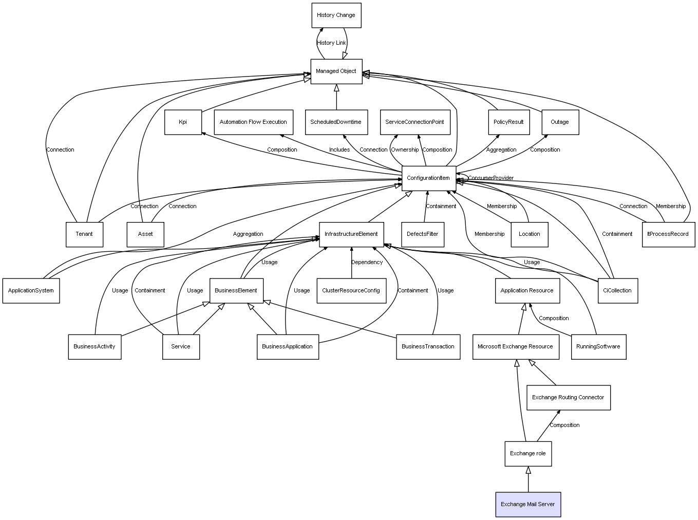 | Exchange role | Exchange Routing Connector | Composition | Represents a relation between 2 objects where one is contained within the other, and the included object can not exist without its container. Therefore, when the container is deleted, all its contained object will be automatically removed |