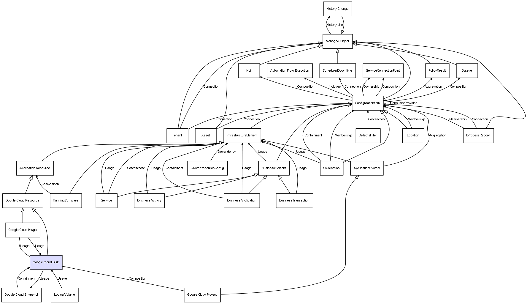 | Google Cloud Project | Google Cloud Disk | Composition | Represents a relation between 2 objects where one is contained within the other, and the included object can not exist without its container. Therefore, when the container is deleted, all its contained object will be automatically removed |