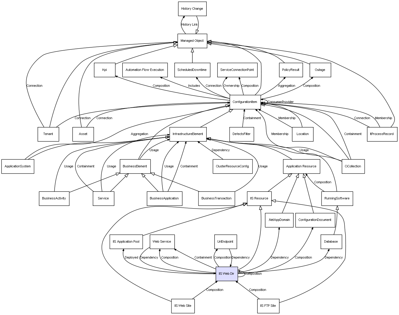 | IIS Web Dir | IIS Web Dir | Composition | Represents a relation between 2 objects where one is contained within the other, and the included object can not exist without its container. Therefore, when the container is deleted, all its contained object will be automatically removed |