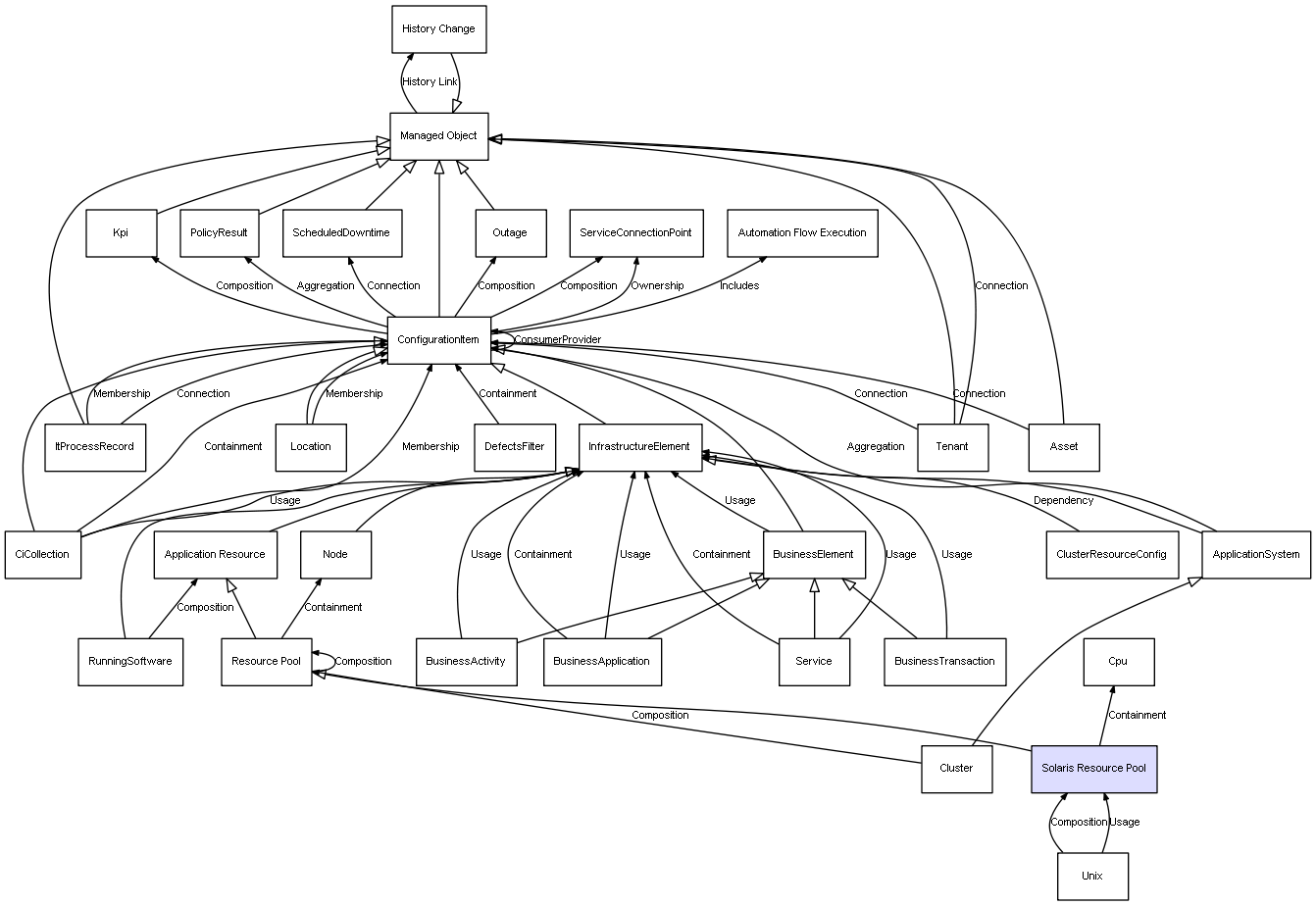 | Unix | Solaris Resource Pool | Composition | Represents a relation between 2 objects where one is contained within the other, and the included object can not exist without its container. Therefore, when the container is deleted, all its contained object will be automatically removed |