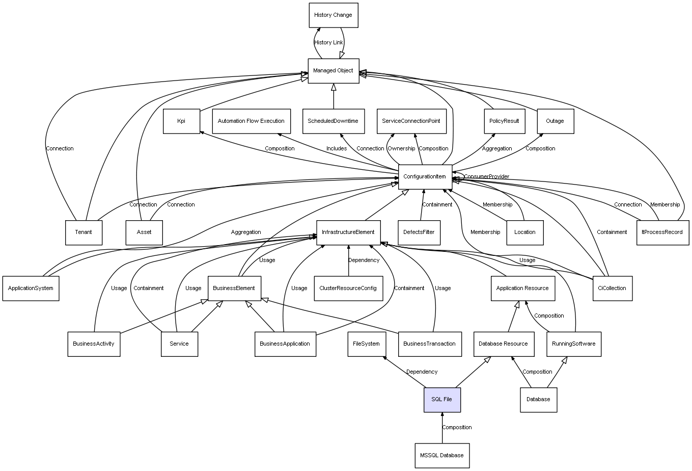 | MSSQL Database | SQL File | Composition | Represents a relation between 2 objects where one is contained within the other, and the included object can not exist without its container. Therefore, when the container is deleted, all its contained object will be automatically removed |