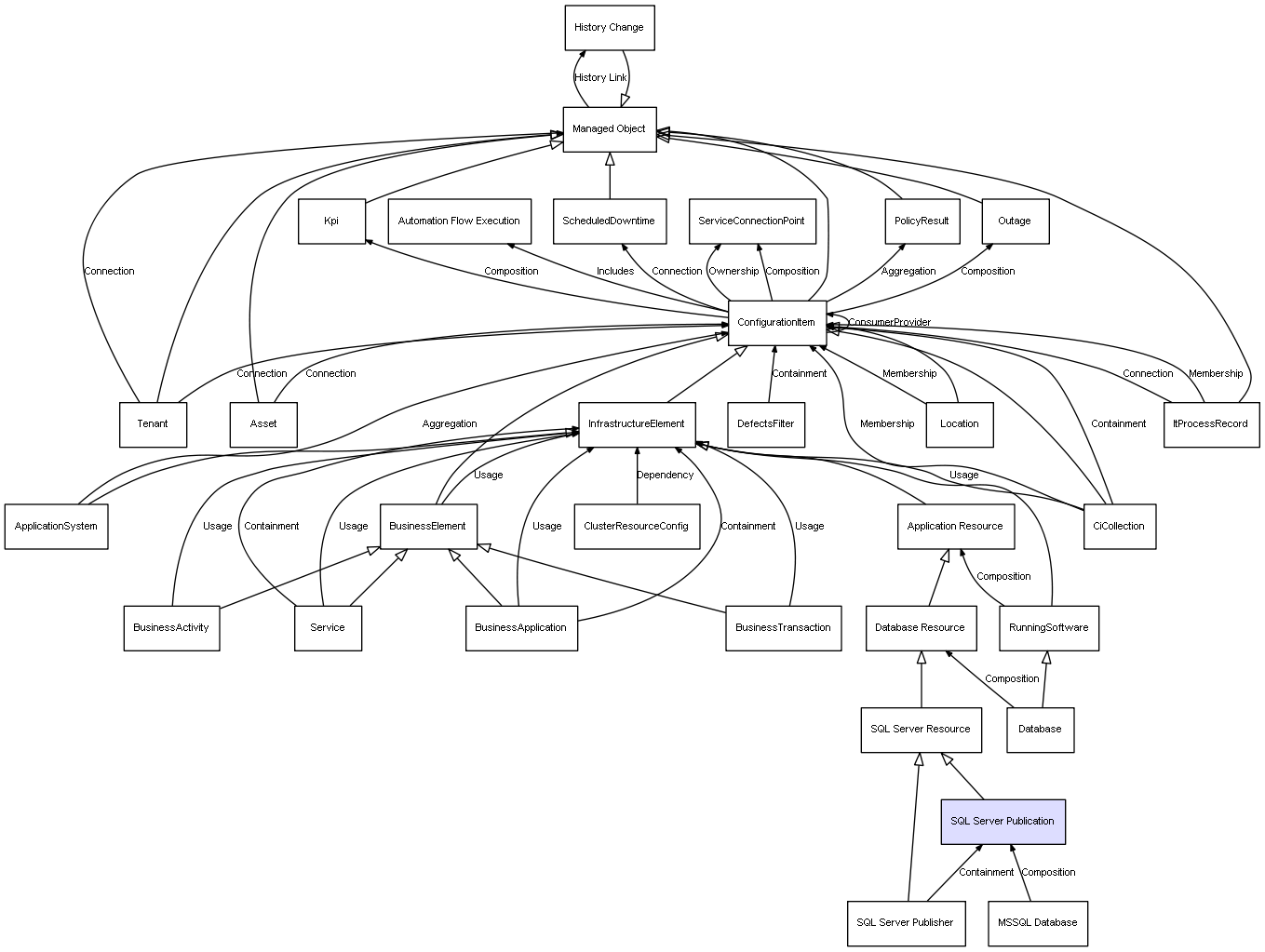| MSSQL Database | SQL Server Publication | Composition | Represents a relation between 2 objects where one is contained within the other, and the included object can not exist without its container. Therefore, when the container is deleted, all its contained object will be automatically removed |