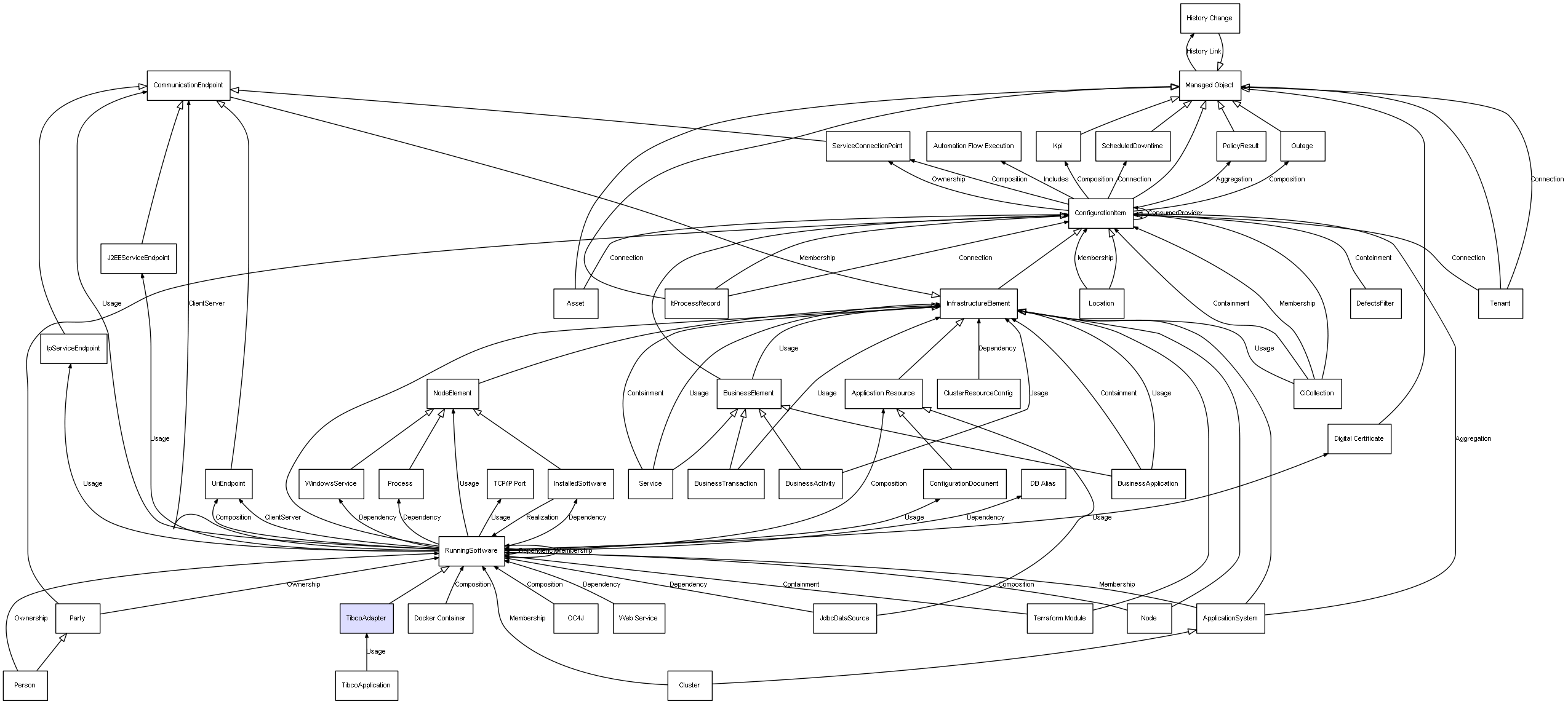 | ConfigurationItem | ServiceConnectionPoint | Composition | Represents a relation between 2 objects where one is contained within the other, and the included object can not exist without its container. Therefore, when the container is deleted, all its contained object will be automatically removed |