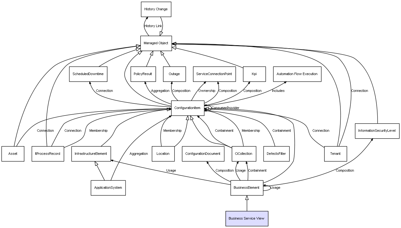 | ConfigurationItem | Outage | Composition | Represents a relation between 2 objects where one is contained within the other, and the included object can not exist without its container. Therefore, when the container is deleted, all its contained object will be automatically removed |