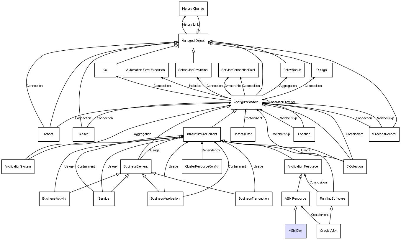 | ConfigurationItem | Outage | Composition | Represents a relation between 2 objects where one is contained within the other, and the included object can not exist without its container. Therefore, when the container is deleted, all its contained object will be automatically removed |