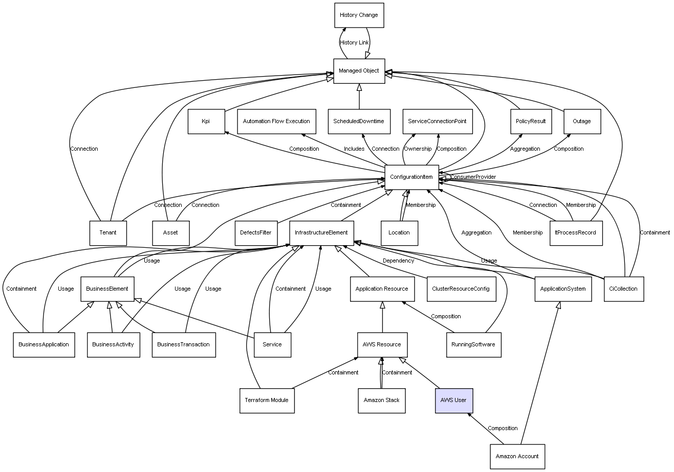 | ConfigurationItem | ServiceConnectionPoint | Composition | Represents a relation between 2 objects where one is contained within the other, and the included object can not exist without its container. Therefore, when the container is deleted, all its contained object will be automatically removed |