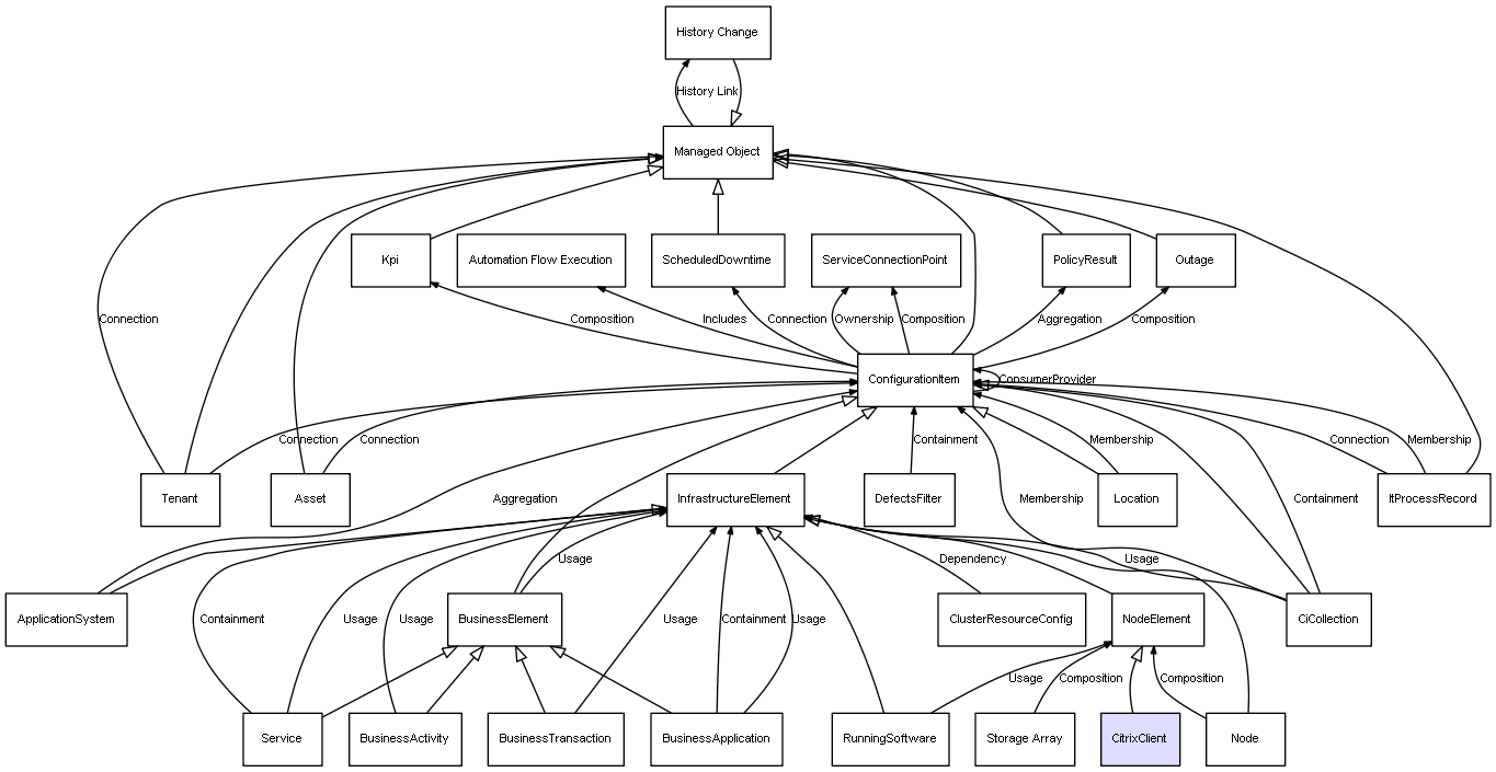 | ConfigurationItem | Outage | Composition | Represents a relation between 2 objects where one is contained within the other, and the included object can not exist without its container. Therefore, when the container is deleted, all its contained object will be automatically removed |