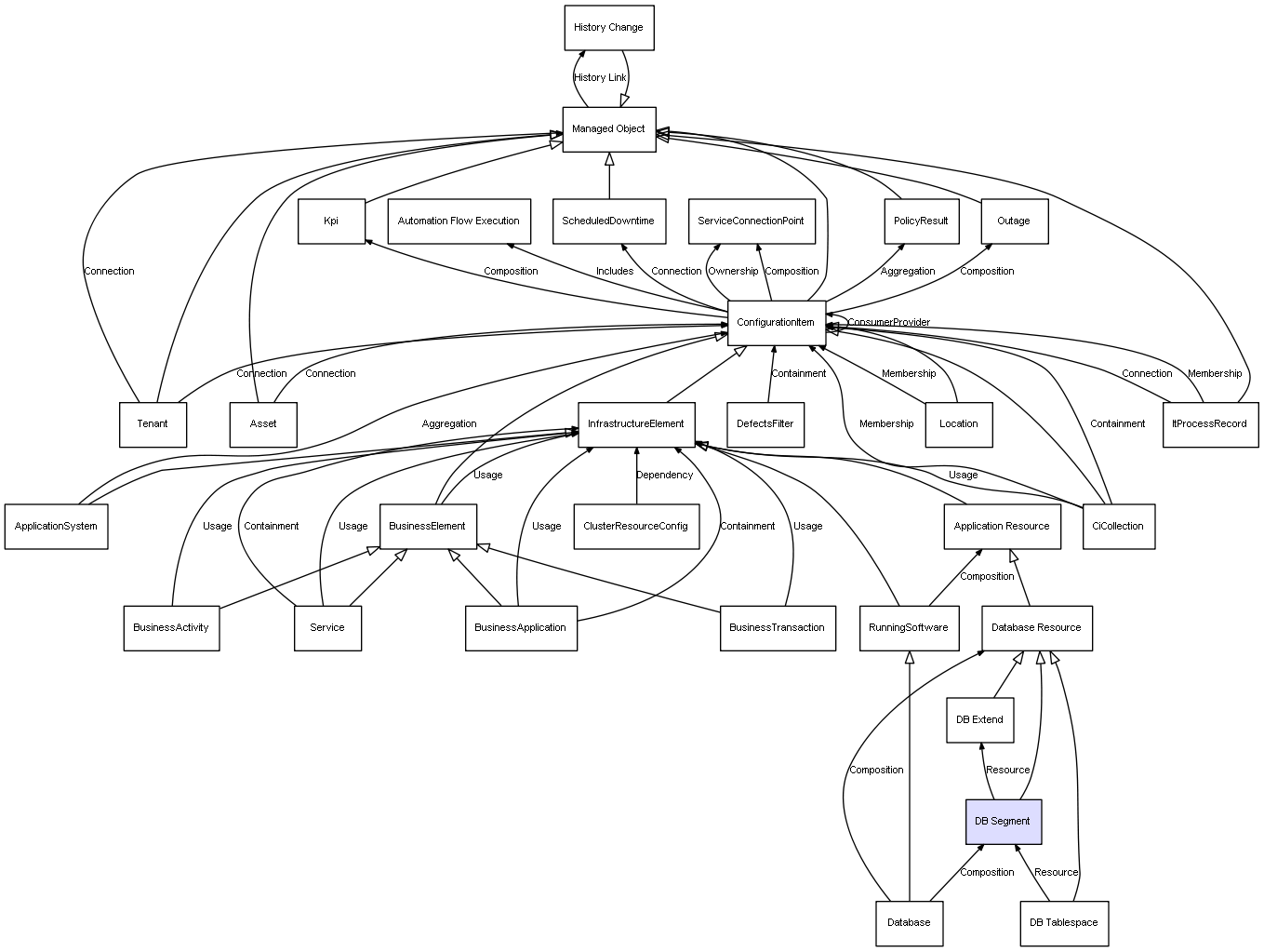 | Database | DB Segment | Composition | Represents a relation between 2 objects where one is contained within the other, and the included object can not exist without its container. Therefore, when the container is deleted, all its contained object will be automatically removed |