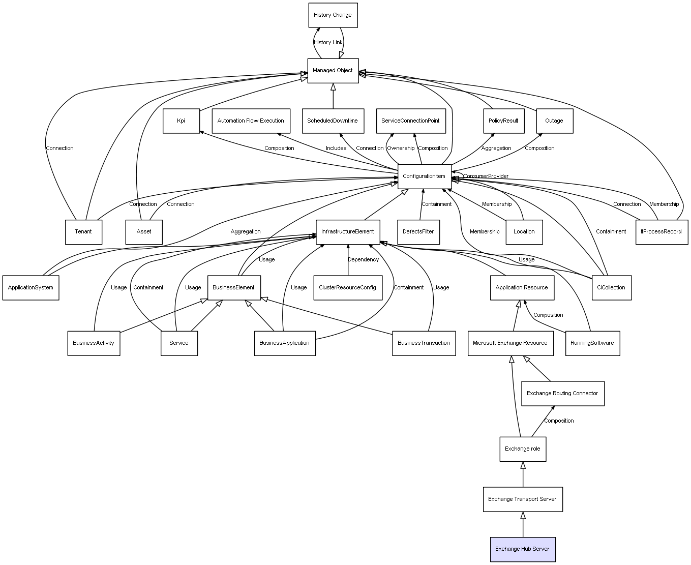 | Exchange role | Exchange Routing Connector | Composition | Represents a relation between 2 objects where one is contained within the other, and the included object can not exist without its container. Therefore, when the container is deleted, all its contained object will be automatically removed |