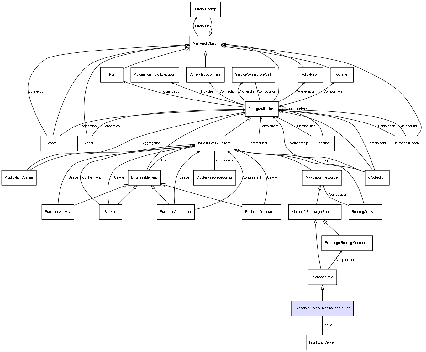 | Exchange role | Exchange Routing Connector | Composition | Represents a relation between 2 objects where one is contained within the other, and the included object can not exist without its container. Therefore, when the container is deleted, all its contained object will be automatically removed |