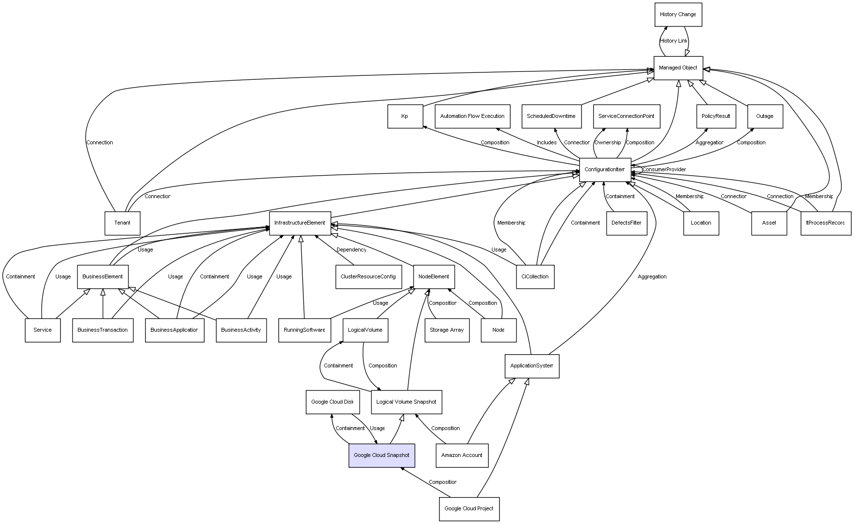 | Google Cloud Project | Google Cloud Snapshot | Composition | Represents a relation between 2 objects where one is contained within the other, and the included object can not exist without its container. Therefore, when the container is deleted, all its contained object will be automatically removed |