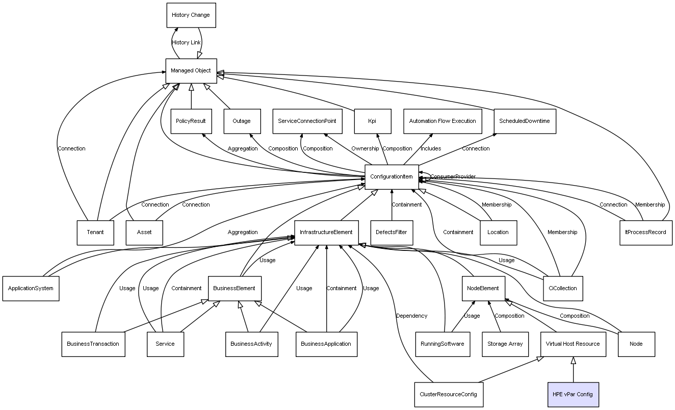 | ConfigurationItem | Outage | Composition | Represents a relation between 2 objects where one is contained within the other, and the included object can not exist without its container. Therefore, when the container is deleted, all its contained object will be automatically removed |