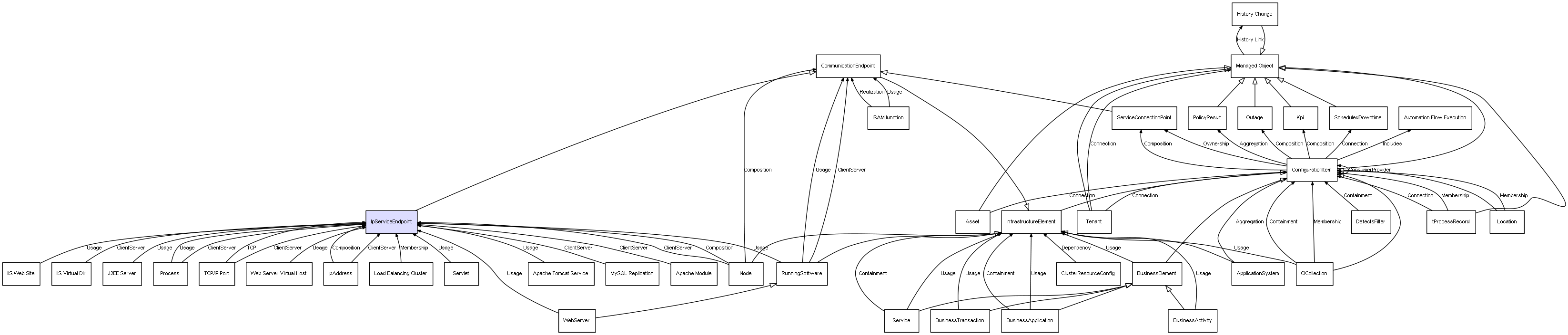 | IpAddress | IpServiceEndpoint | Composition | Represents a relation between 2 objects where one is contained within the other, and the included object can not exist without its container. Therefore, when the container is deleted, all its contained object will be automatically removed |