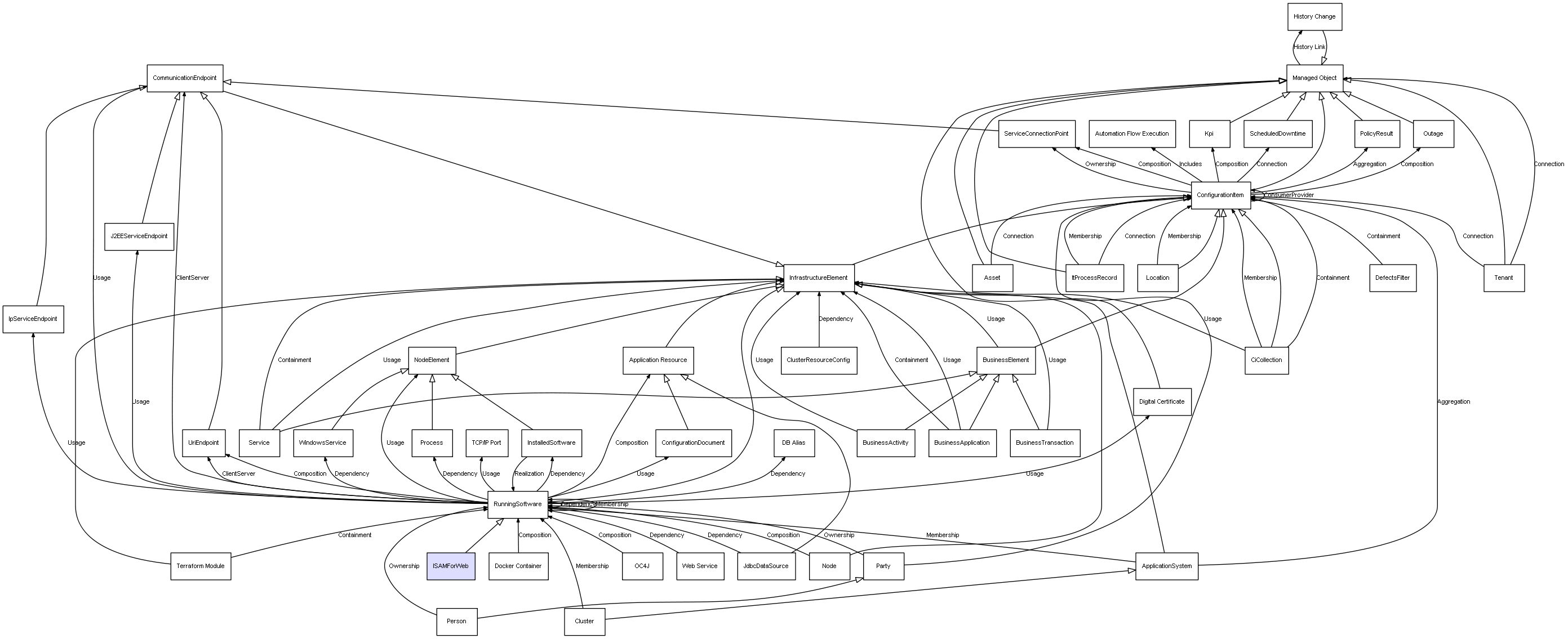 | ConfigurationItem | ServiceConnectionPoint | Composition | Represents a relation between 2 objects where one is contained within the other, and the included object can not exist without its container. Therefore, when the container is deleted, all its contained object will be automatically removed |