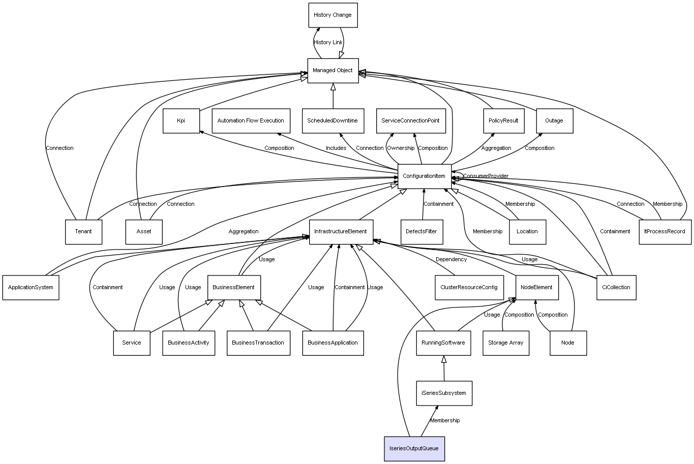 | ConfigurationItem | ServiceConnectionPoint | Composition | Represents a relation between 2 objects where one is contained within the other, and the included object can not exist without its container. Therefore, when the container is deleted, all its contained object will be automatically removed |