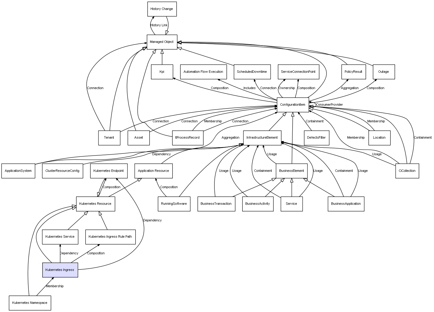 | ConfigurationItem | ServiceConnectionPoint | Composition | Represents a relation between 2 objects where one is contained within the other, and the included object can not exist without its container. Therefore, when the container is deleted, all its contained object will be automatically removed |