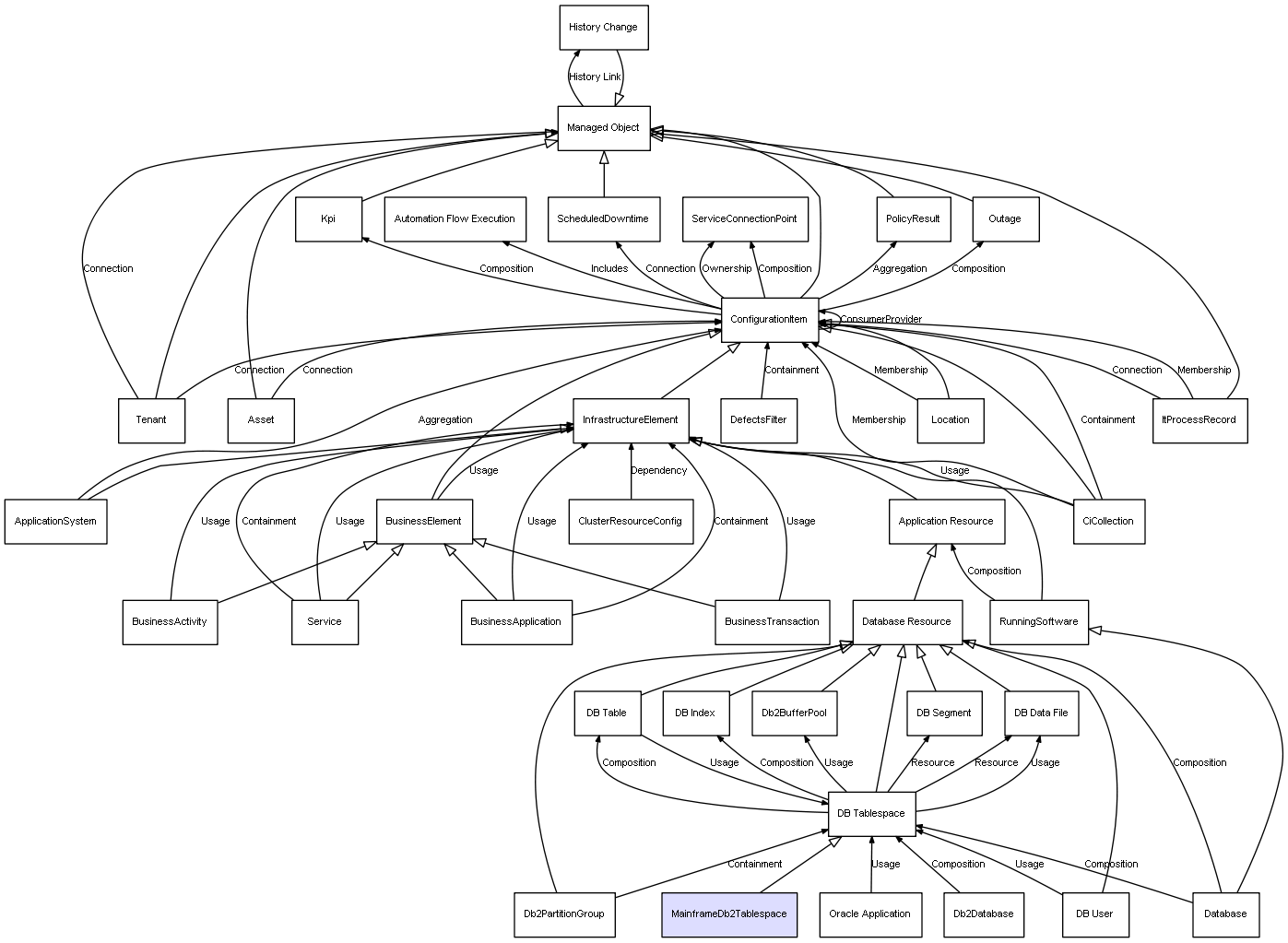 | Database | DB Tablespace | Composition | Represents a relation between 2 objects where one is contained within the other, and the included object can not exist without its container. Therefore, when the container is deleted, all its contained object will be automatically removed |